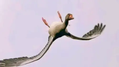 Crucially, the goose twists its neck and head a full 180 degrees as well, allowing it to keep its eyes fixed on its flight path and maintain perfect spatial awareness. From below, it looks like a goose flying normally but with its body attached the wrong way up.